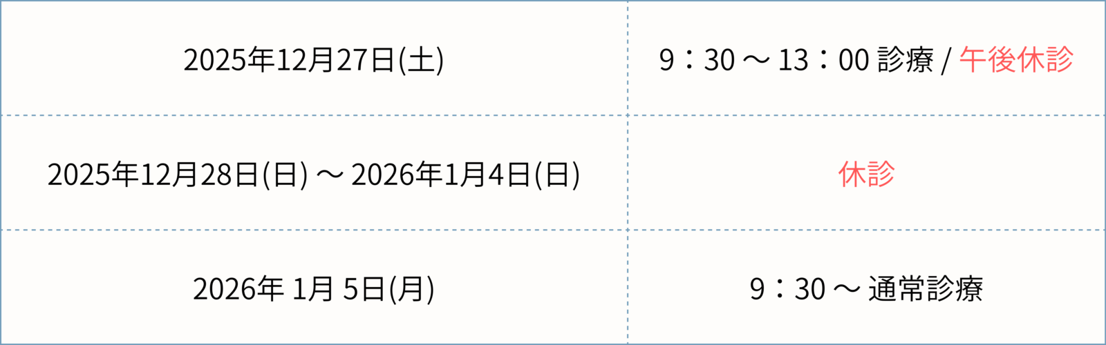 年末年始の診療につきましては、誠に勝手ながら下記の通りとさせていただきます。皆さまにはご不便をおかけいたしますが、何卒ご了承くださいますようお願い申し上げます。